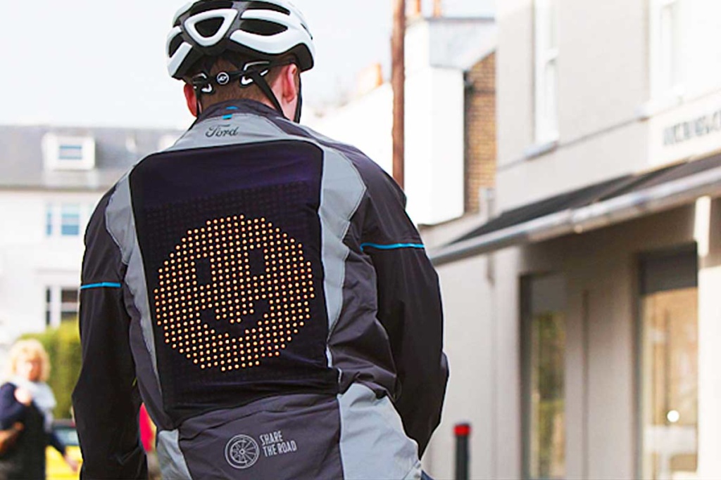 But, it’s a bit difficult for cyclists to indicate changes in direction. Because they have to remove their hands from the handlebars to communicate. Ford believes that better communication between cyclists and drivers could reduce accidents. Therefore, Ford Europe teamed up with cyclists and communications specialists to develop the prototype emoji cycling jacket as part of their ‘Share The Road’ campaign.