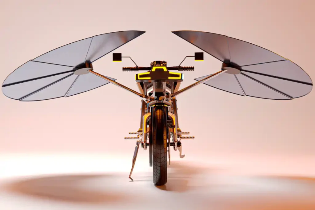 At the core of Solaris is a solar-only operating system. The motorcycle uses retractable photovoltaic wings that unfold into a circular solar array when parked. These solar panels collect, concentrate, and convert sunlight into electrical energy, which is then stored in a high-capacity lithium battery system. In this state, Solaris effectively becomes its own charging station, independent of grids, plugs, or fuel stations.