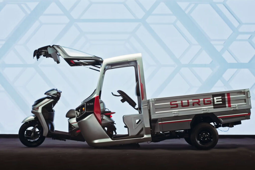 The Surge S32 is a combination of an auto-rickshaw and a scooter to achieve cargo and passenger transportation and easy maneuverability and parking at the same time. With the ability to seamlessly switch between two-wheeler and three-wheeler modes in just three minutes, the Surge S32 is designed to adapt to your changing needs.