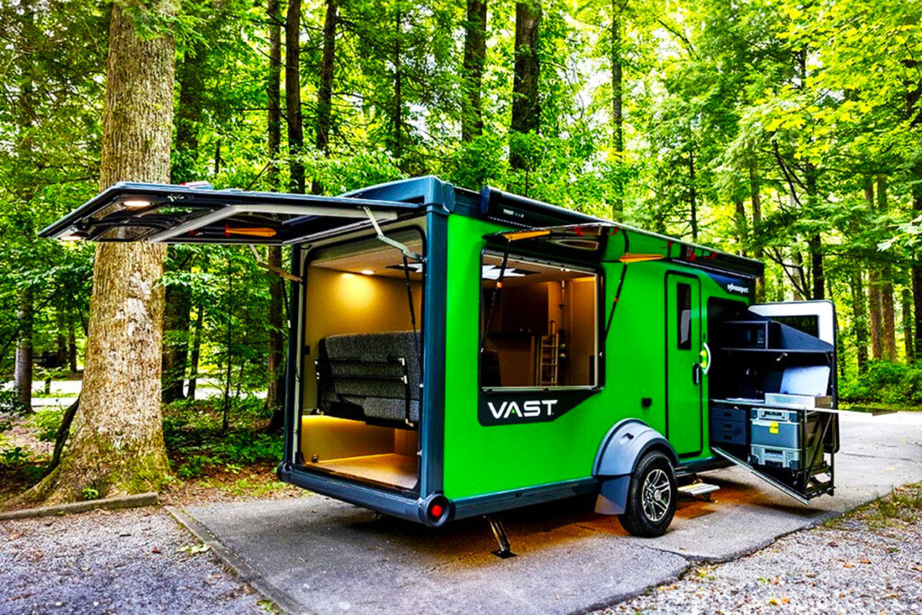 The kitchen is a testament to VAST’s commitment to outdoor living. A two-burner gas stove, portable refrigerator/freezer, integrated sink, residential-sized faucet, and microwave oven redefine outdoor culinary convenience. VAST’s precision track system allows the entire lounge area to slide forward, revealing substantial interior cargo space for bikes.