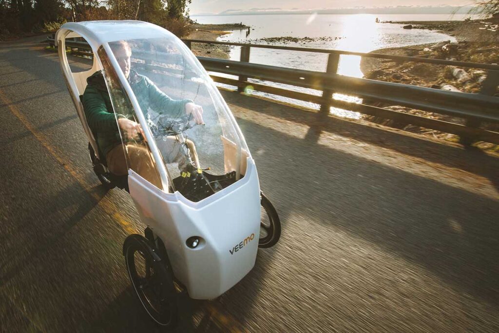 The Veemo pedal-electric Velomobile has city-friendly dimensions